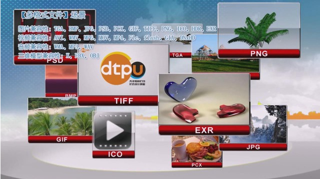 多格式兼容 系统具有广泛的兼容性,可以导入各类外部素材,包括三维模型、图片、视音频文件等。三维模型包括X、FBX和OBJ格式,并支持关键帧动画和骨骼动画的一同导入。图片包括TGA、BMP、JPG、PSD、PCX、GIF、TIFF、PNG、ICO、HDR、EXR等,其中PSD文件支持分层导入。采用大洋多年技术积累推出的先进编解码技术,支持多种压缩格式的高标清视频文件,视频包括AVI、WMV、MPG、MOV、MP4、Flc、FLI、PBF、flash,音频包括RM、WMA、MP3、WAV。