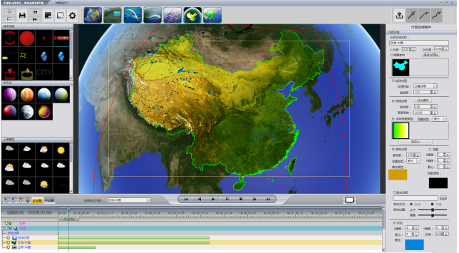 三维地图制作软件3DMaps DAURIC-3DMaps系统是一个真正的三维地图系统,采用全球三维高程模型,通过丰富的地表纹理展现出不同风格的地表地貌。系统提供全球地标点的精确定位、3D地图的分级索引以及高精度的公路、河流、行政边界,可以快速制作出地图漫游、事件模拟等效果,广泛应用于气象、交通、时事等栏目,丰富节目的表现形式。
