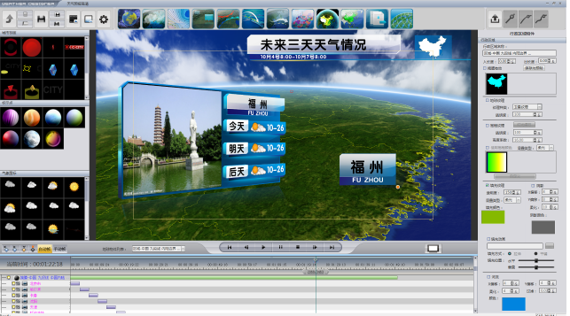 DAURIC-Weather是一款专业的气象包装系统,系统支持DAURIC-3DMaps系统中所有地图功能,并针对气象节目制作需求,提供了丰富的气象快捷制作工具,为用户提供方便快捷的气象图文动画制作工具;提供专业播出控制模块,进行节目单制作和播出控制;同时配备专业的字图文动画受控播出软件,提供稳定的三维图文场景全实时播出,极丰富了节目的表现形式。