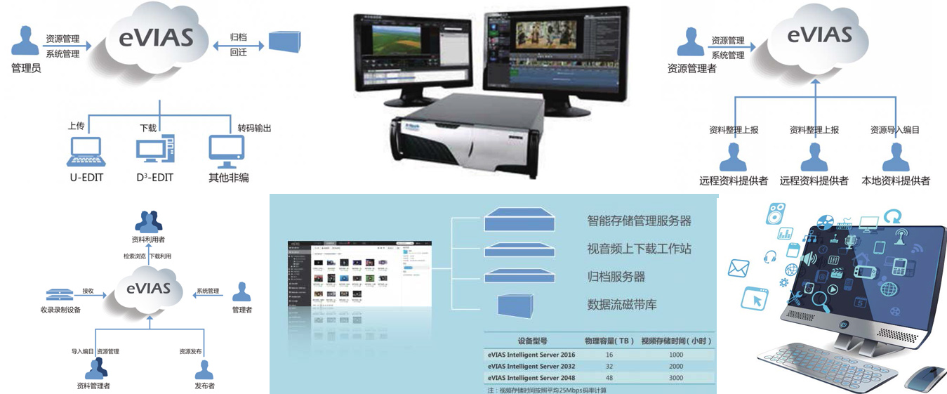 eVIAS声像资料数字化管理系统,是以媒体数字化处理技术及互联网技术为基础构建的专业数字资产管理系统,针对视频、音频、图片、文档等各类多媒体资源,该系统实现数字化收集、加工、智能管理、发布展示及存储归档等全方位的功能,可以为不同行业提供各具特色的一体化解决方案。 eVIAS提供海量声像数据从收集、