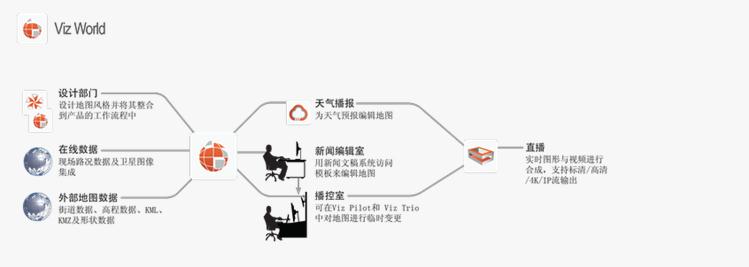 工作在模板上Viz World 可以让制片人、记者和操作人员在任何图形模板中使用地图和地理信息。Viz World 整合了大量的 Vizrt 产品,像 Viz Pilot 、Viz Trio、 Viz Weather、MAM 和在线工作流程。通过编辑地图元素,用户可以改变地图位置,添加三维物体和动画标签,展示街道和交通信息,显示所选地 区卫星图片,创建位置导航,设计全动画的实时三维地图。